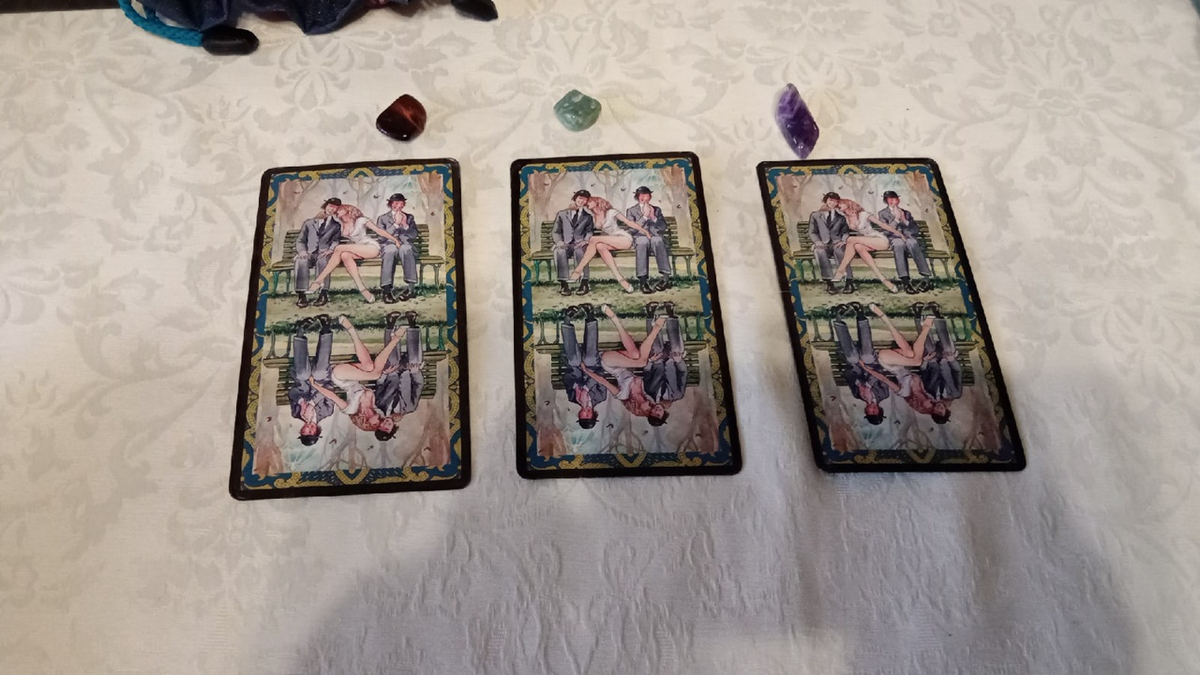 Перевернута Королева Кубков и 3 Земли. Нет никого, любимая женщина отвернулась и туз Воды тоже перевернут, отношения разорваны и он весь сейчас какой-то потерянный, холодный к другим женщинам. У него есть планы помириться, но вот когда- вопрос. Пятерка здесь, от 5 дней до 5 месяцев может быть или 5 недель, но это все условно очень, события и решения влияют на сроки.