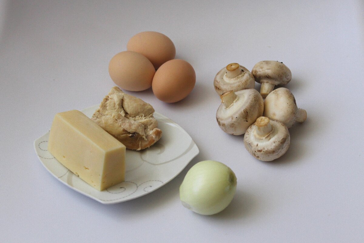 Этот салат горячо любим в нашей семье. Готовим его практически на каждый праздник уже много лет. И всегда, на любом застолье, он расходится быстро и съедается полностью. Считаю, что секрет успеха в удачном сочетании продуктов — курицы, жареных грибов и сыра. Все ингредиенты идеально подходят по вкусу. Если вы ещё не готовили такой салат, то обязательно попробуйте. Ингредиенты: Куриное филе — 1 шт. Шампиньоны свежие — 7-10 шт. Лук — 1 шт. Твёрдый сыр — 150 гр Яйца — 3 шт. Майонез Соль Растительное масло для жарки Подготовка: 1.Отвариваем филе курицы в подсоленной воде и нарезаем мелкими кубиками. 2.Режем грибы и шинкуем лук, обжариваем их вместе на растительном масле до готовности, солим. 3.Отвариваем яйца и натираем на крупной тёрке сыр. Собираем салат слоями: 1.Выкладываем на блюдо нарезанную курицу и делаем сеточку из майонеза. Чтобы сделать тонкую майонезную сеточку, возьмите обычный целлофановый пакет, выдавите в один из его уголков нужное количество майонеза и обрежьте краеш