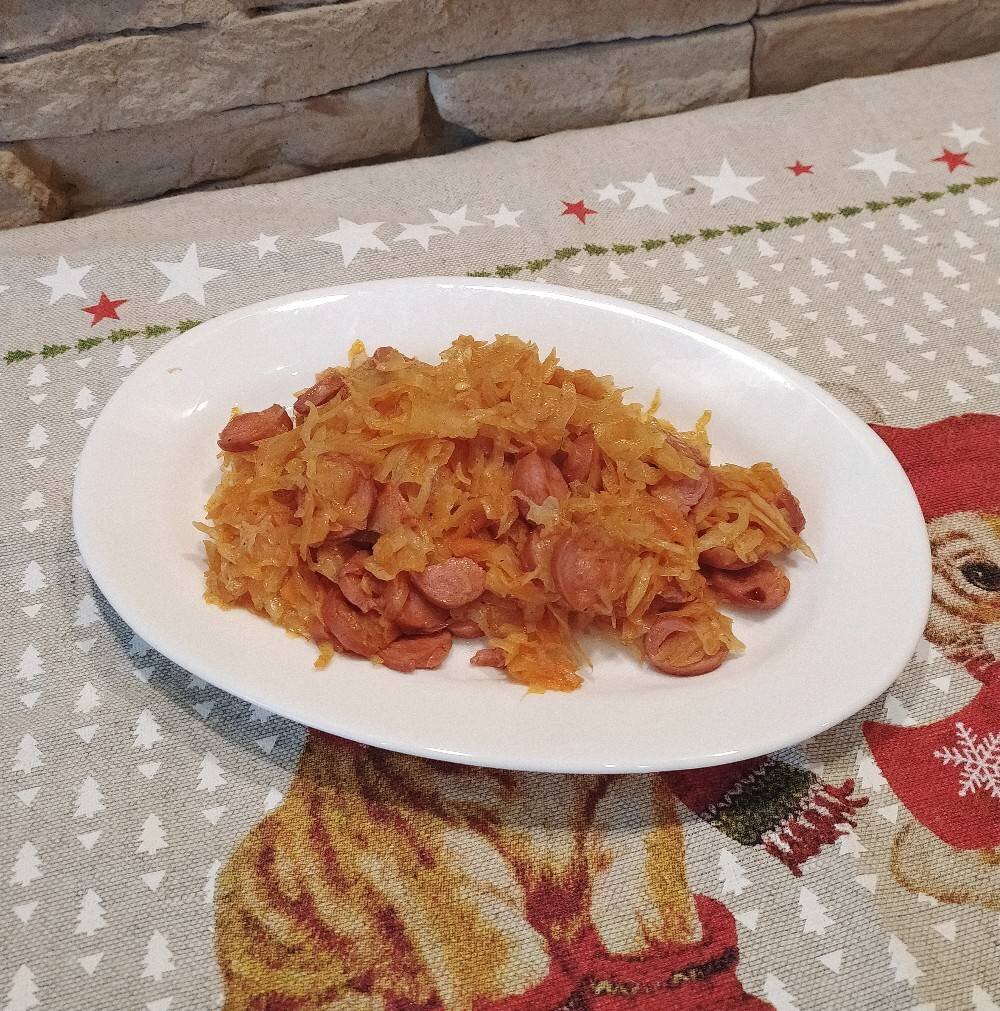 Ингредиенты: Капуста маленький кочан, Сосиски, Лук репчатый, Морковка средняя, Вода, Томатная паста , Соль, перец, сахар , Растительное масло Способ приготовления: Капуста нашинковать соломкой. Лук нарезать кубиком, морковь натереть на крупной терке. Сосиски нарезать кружочками. Масло разогреть на сковороде. Лук и морковку пассеровать. Добавить сосиски и обжарить пару минут. Затем добавить томатную пасту и перемешать. Добавить соль, перец и немного сахара. Можно не добавлять сахар, он даёт приятную сладость, убивает кислоту томатной пасты. Добавить всю капуста и валить воду. Аккуратно перемешать и томить под крышкой, на малом огне. Готовить пока капуста не станет мягкая. Примерно это займёт минут 15. Приятного Вам аппетита!