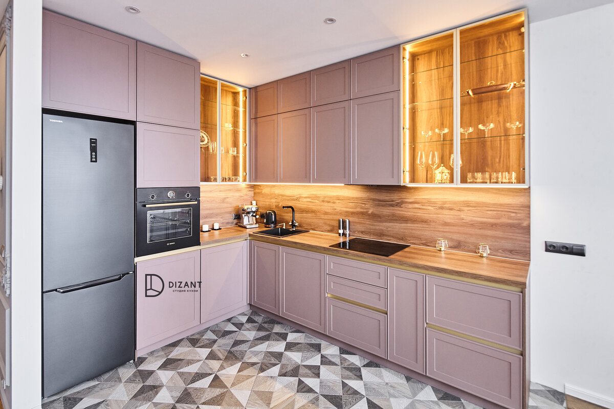 Подпишитесь на нас, если хотите такую же кухню, но по вашим размерам и предпочтениям в цвете. Больше фото проекта под описанием внизу. Обращаем внимание на фасады, такая фрезеровка сейчас ультра полярная и останется таковой на долгие годы. А ещё, нам удалось разместить, в довольно небольшой размер и стиралку и посудомойку. Получилось очень функционально, при этом внешний вид никак не пострадал. Ну и как не отметить работу нашего дизайнера со светом. Плюс, с подсветкой отлично сочетается профиль в золотом цвете. Рассказываем детально: • Фасады из МДФ покрытые матовой эмалью;