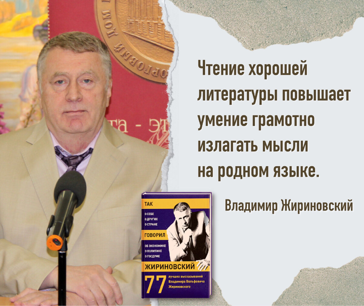 Всего три недели не дожил до своего 76-летия один из самых харизматичных и популярных политиков России. Наверное, основным отличием Владимира Вольфовича от многих «собратьев по управлению» было то, что он всегда искренне переживал за судьбу своей страны, стараясь с присущим ему напором не только привлекать внимание к насущным проблемам, но и предлагать пути их решения. Неоднократно политик поднимал вопросы, связанные с российской культурой, литературой, книгоизданием и чтением. Это и неудивительно: Владимир Вольфович написал более пятидесяти книг – «Социология мировой интеграции», «Русский характер», «Непарадные портреты», «Хроника русской истории», «Утомленная планета», «Мои прогнозы сбылись», многие из которых он анонсировал в старейшем книжном магазине России «Библио-Глобус», вызывая непременный ажиотаж и аншлаги – почти как в театре. «Так, в "Последнем броске на Юг", написанном в 1993 году, я дал сценарий того, что происходит сейчас. В сборнике статей "Последний вагон на Север" ре