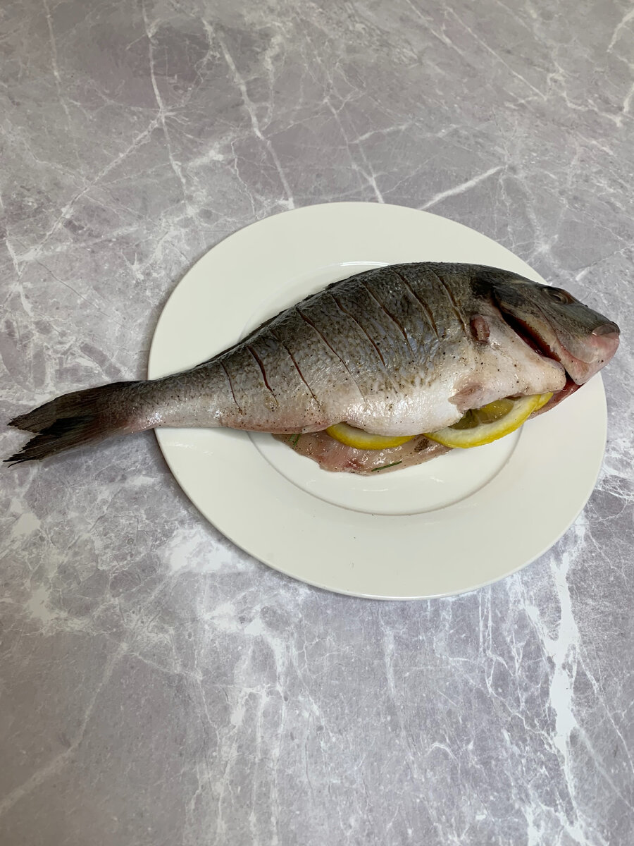 Всем доброго времени суток. Сегодня разнообразим нашу ленту, очень простым средиземноморским рецептом рыбки Дорадо. В среднем, в магазинах она стоит в районе 700 р за килограмм. Одна рыба примерно рублей 200, по затратам на все ингредиенты большой суммы не получится и свободен можно удивлять и баловать ваших гостей. Ингредиенты Сначала подготовим нашу рыбку. Делаем небольшие надрезы по всей рыбине. Затем обильно обмазываем солью и перцем с двух сторон, таким же образом внутри рыбы. Обильно выжимаем апельсиновый сок внутрь и снаружи Дорады. Далее шпигуем рыбку лимоном и веткой розмарина. Даем полежать минут 10. Заворачиваем в два слоя фольги и отправляем в духовку на 30 мин при температуре 180 градусов. По истечении пол часа наша Дорадо готова. Рыба нежная, проступают нотки цитрусовых. Дорадо очень легкая в приготовлении и вкусная на все 100 балов. Пробовать всем. Буду благодарен вашим отзывам и замечаниям. Всегда прислушиваюсь к своей аудитории. Всем спасибо. #рыбка #рецепт #д