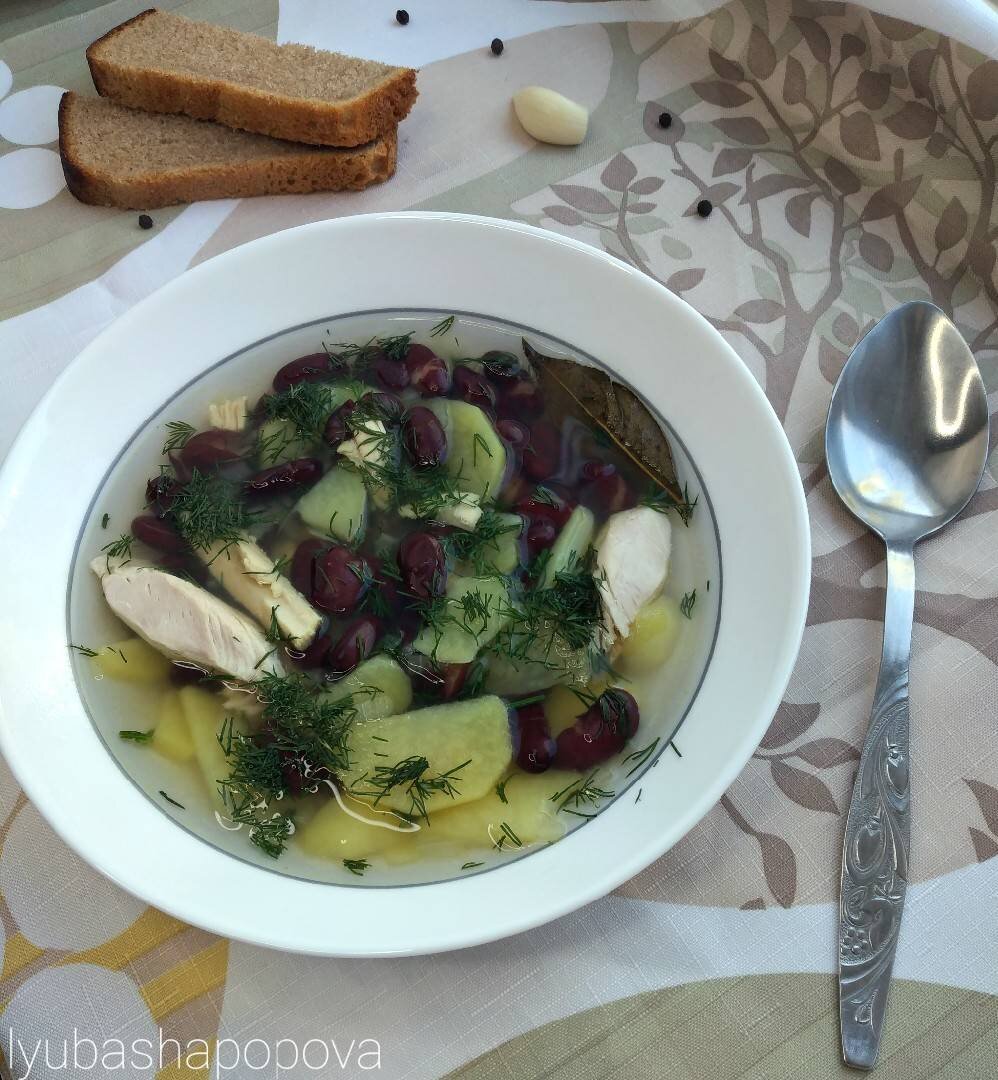 Ингредиенты: остов куриной грудки, воды, консервированной красной фасоли, луковица, картофелины, лавровый, по вкусу соль, молотый чёрный перец, молотая красная паприка, молотый мускатный орех, молотый кориандр, куркума