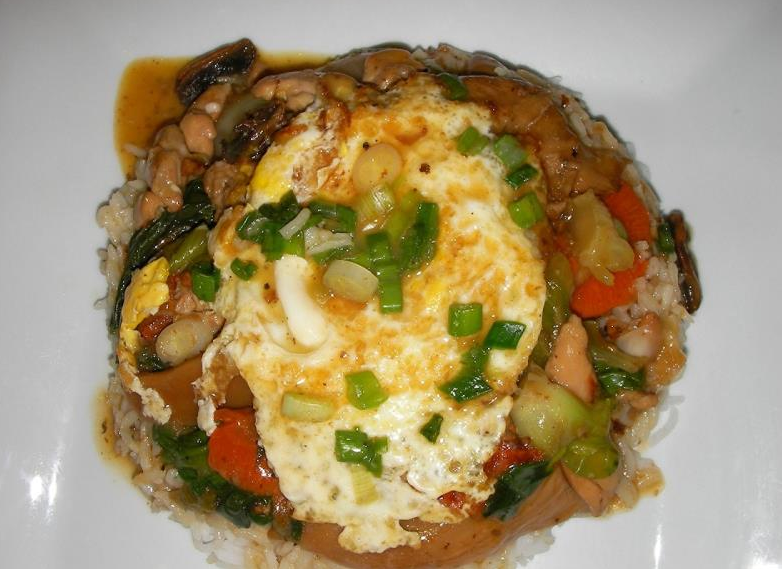 Слой риса покрыт смесью из курицы, креветок, грибов, китайских листьев и моркови в густом соусе и залит яйцом - невероятно вкусно!