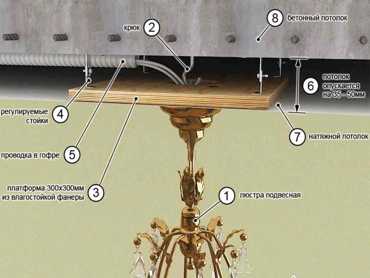 Когда конструкция натяжного потолка надежно закреплена, нужно понять, как вешать люстры. Конечно, вы можете использовать точечные потолочные светильники, однако их будет недостаточно, особенно, если речь идет об оформлении просторной гостиной или квартиры-студии. Интерьер без люстры часто выглядит незавершенным. Светильники чаще всего крепятся в середине потолка, обеспечивая равномерное и достаточно яркое освещение комнаты, которое невозможно создать в комнатах с высокими потолками, используя только светодиодную подсветку или точечные элементы. ВЫБОР ЛЮСТРЫ ДЛЯ НАТЯЖНОГО ПОТОЛКА Перед покупкой люстры убедитесь, что световое оборудование отвечает всем нижеперечисленным критериям: ВАРИАНТЫ МОНТАЖА ПОТОЛОЧНЫХ СВЕТИЛЬНИКОВ Прежде, чем ответить на вопрос, как крепятся люстры, нужно обратить внимание на особенности конструкции и размера осветительного прибора. В зависимости от этого будет осуществляться выбор варианта монтажа. Поэтому приборы лучше приобретать заранее, чтобы до установки нат