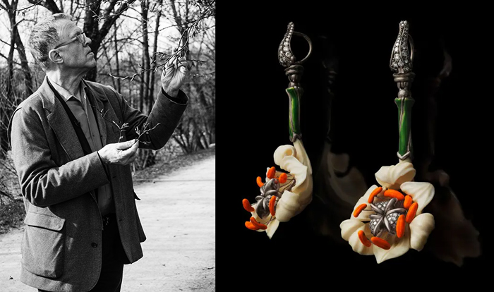Черпая идеи не только в прошлом, но и в красоте природы, Отто Якоб совмещает, казалось бы, несовместимое. В его украшениях, сложно сконструированных, многосоставных, можно найти и слепки крыльев кузнечика, и формы грецкого ореха, и фигуры кельтских богов, и переливающихся хамелеонов из витражной эмали.