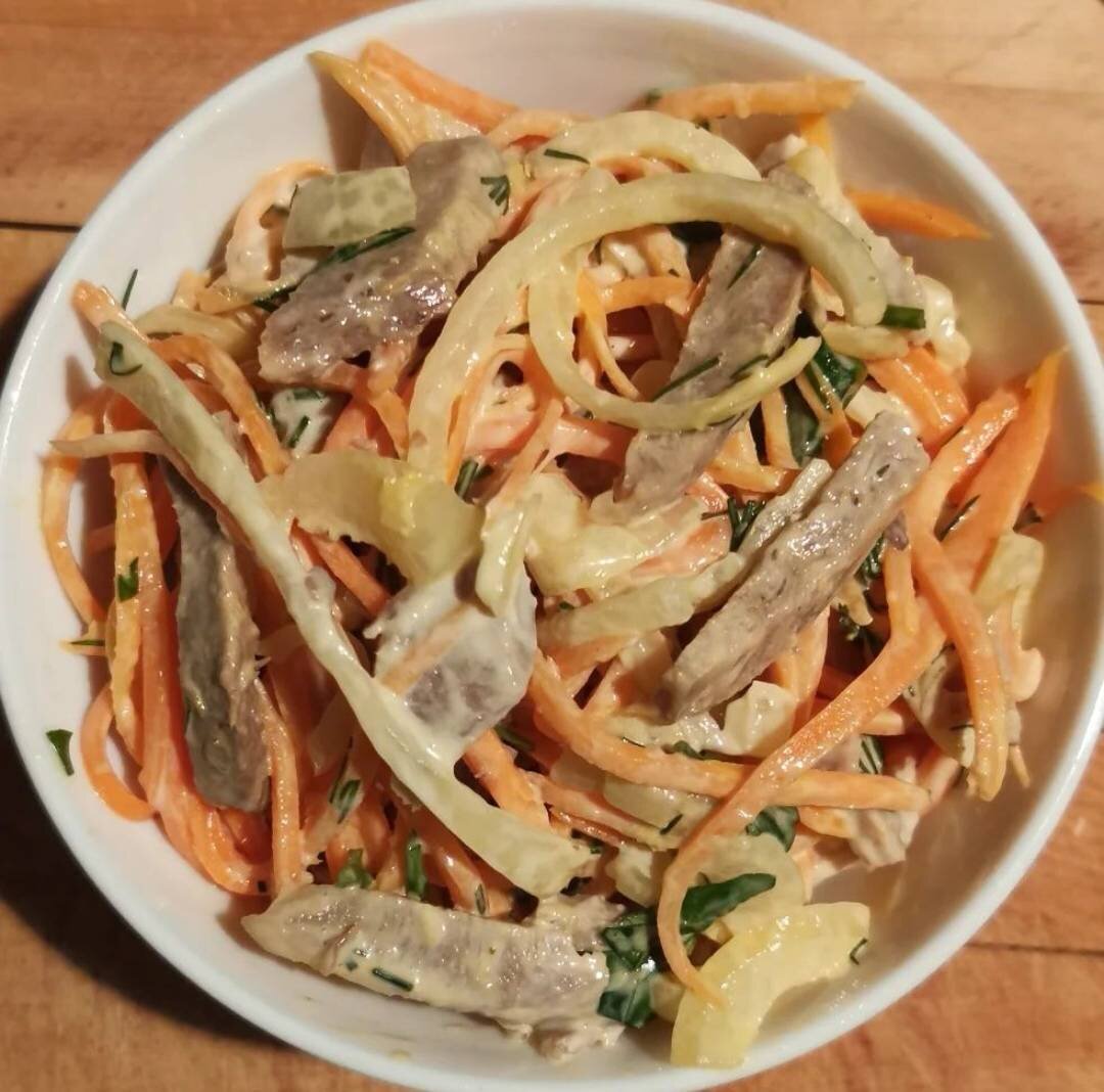 Ингредиенты: Язык отварной, Морковь по-корейски, Лук маринованный, Петрушка, Майонез, Рисовый уксус, Сахар