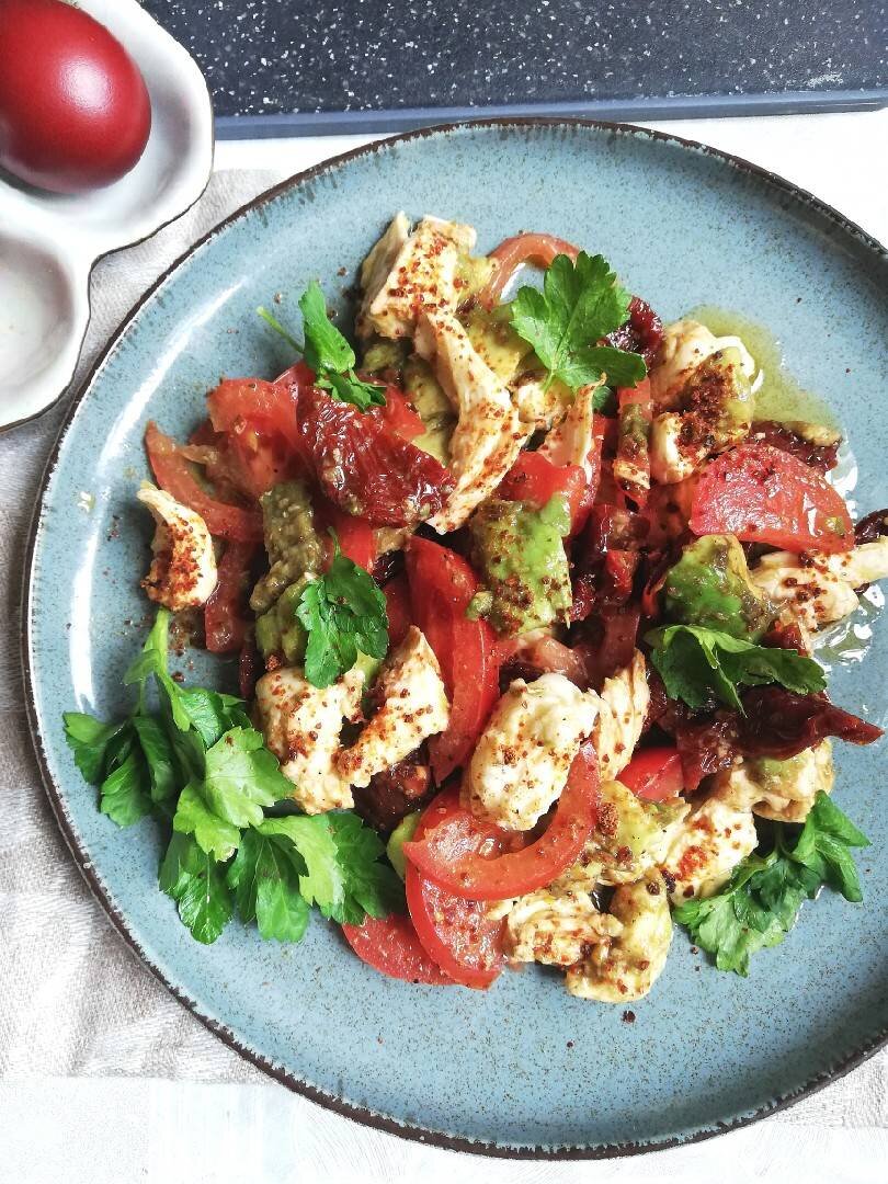 Ингредиенты: гр авокадо (можно и больше), шарик (100 гр) моцарелла в рассоле, гр томат свежий, гр томаты вяленые (у меня домашние), л масло оливковое (у меня масло от вяленых томатов), л бальзамическй уксус, по вкусу соль, перец, сахар, рубленый свежий базилик, рубленая свежая кинза