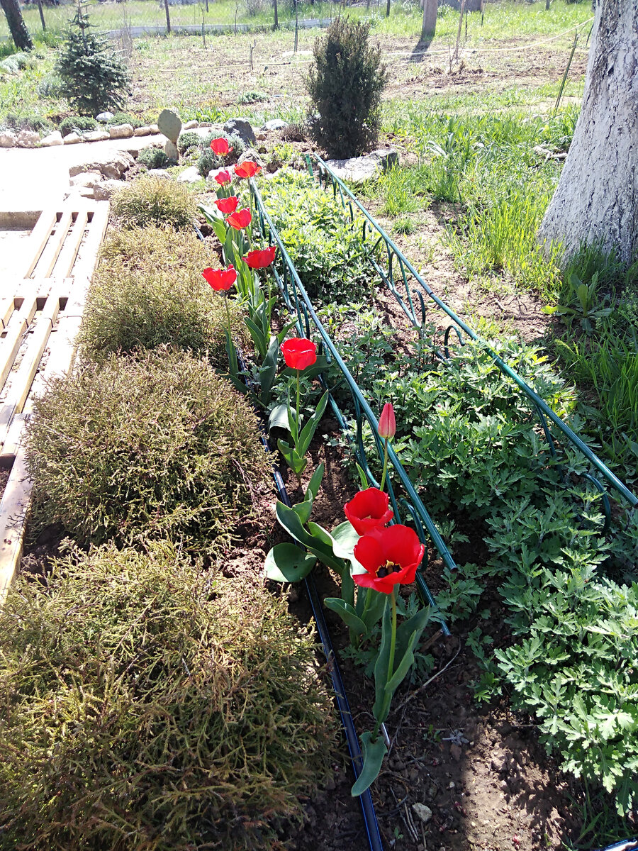 В Крыму замечательная погода! Как по заказу на Пасху стоят солнечные, тёплые, безветренные дни. Такие яркие, ласковые. Какое-то обновление произошло и в природе и в душах в этот радостный день. Мы его провели на даче. Утром сбегала в церковь освятила яйца и кулич. Позавтракали и поехали. На даче меня встретили мои тюльпаны. Подумаешь – невидаль, тюльпаны в конце апреля. Но это же мои! Первые в жизни мои тюльпаны! Понимаю, что восторги мои забавны. Но я почти всю жизнь провела на севере. Дачи у меня никогда не было. А тут из земли и воды и ещё какого-то волшебства появилась эта красота. Пока не привыкла. А вот нарциссы у меня уже третий год. Этой весной они совсем в травяных дебрях потерялись… Знаю, знаю, надо косить и полоть. Пока живу в городе, ничего не успеваю. Но собираюсь уже переезжать в свой домик у моря. Всё идёт по плану. Пробежала по саду. Если не обращать внимание на траву, то все растишки радуют. Клематис Балерина дал несколько новых побегов. Ему только второй год, но в пр