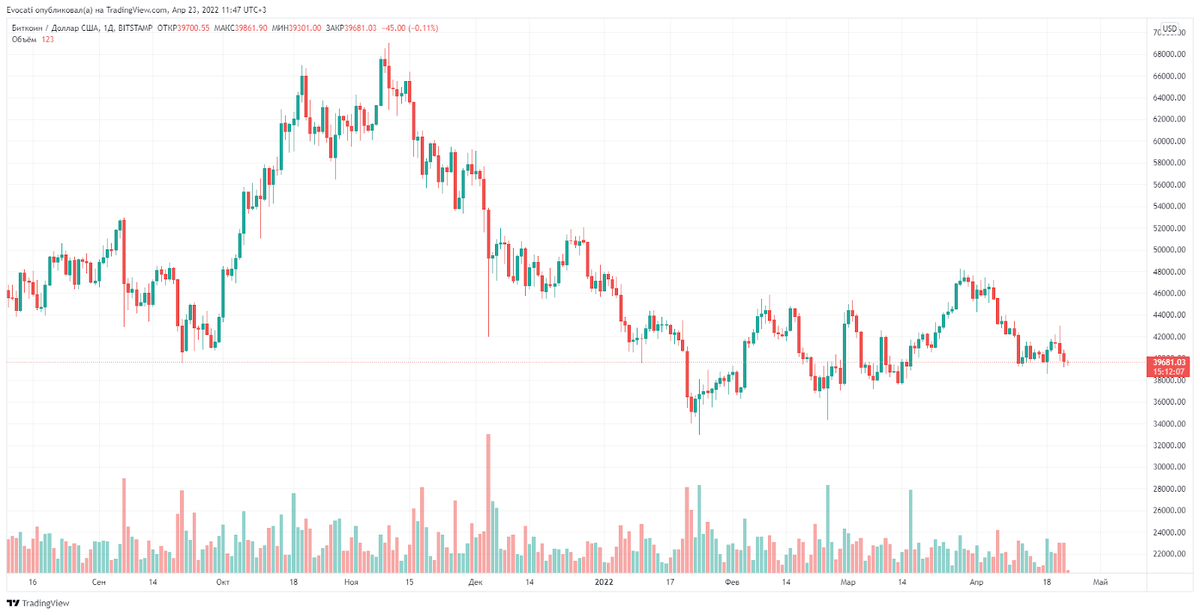 Вот график Биткоина D1, то есть каждый столбец индикатора показывает, какое количество монет биткоина было проторговано за каждый день на выбранной криптобирже.
