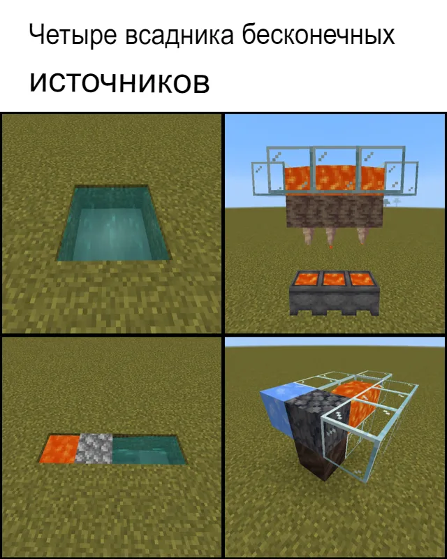 Всем привет! Подборка сегодня вышла поздно... Настроения не было и голова болела, поэтому я и не смог вовремя выпустить. Плюсом сегодня урок программирования, в общем, каюсь. Ну а щас приступим к самой подборке! 1. Бесконечность! Настоящие всадники бесконечности! Но вот с котлами и лавой не очень практично, ибо процесс там уж слишком долгий... А вот всё остальное весьма полезно в постройках! Когда нужно много лёгких ресурсов, то на помощь приходят базальтовые и булыжниковые генераторы! А генератор воды просто классика, почти всегда выручает. 2. Эм... Оке... Весьма суровый мем, но я с него проржался, даже ситуацию представить смог) А ведь реально, вот получается он просто потом переходит на другой проект, по сути ведь мы бесплатно пользуемся сервером, так же и утробам матери :/ 3. Тест на выносливость Часто вижу такой мем и постоянно удивляюсь, мол, реально что ли компьютер так сильно нагружается от этого? А не просто ли майнкрафт вылетит? Вот всегда задумываюсь и никогда не проверяю, в