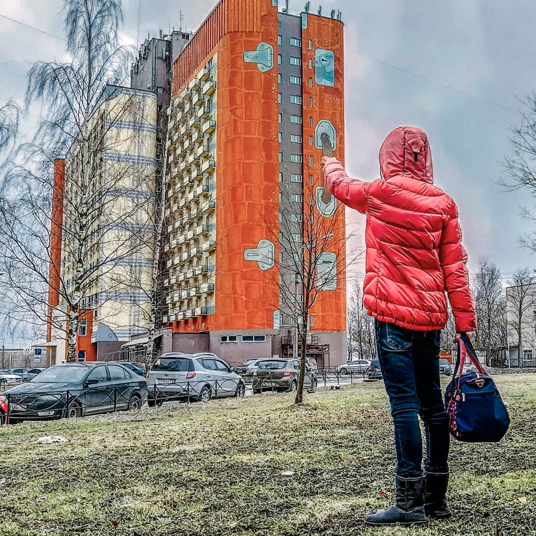 Согласитесь, что слегка не по размеру Юля решила чемодан утащить? И знаете, что интересно? Здесь нет ни грамма фотошопа. Это действительно дом-чемодан, стоящий среди типичных хрущёвок и прочих построек советского времени (и парочки новостроек). И выглядит весь необычно. Вообще, на фоне застройки некогда городских окраин человейниками типа Парнаса, Мурино, Кудрово (мы, если что, сами в человейнике живем. Так что никого ни в коем случае не стремлюсь обидеть), такие необычные дома прямо радуют глаз. Ведь что такое новый Петербург? Ну по сути, примерно вот так: Современные технологии позволяют кварталами прямо на глазах возводить недорогое и доступное жилье (недорогое, видимо, только с точки зрения застройщика и государства). И в погоне за прибылью лепятся максимально высокие здания, с максимальной плотностью квартир на этаж. В квартале, где мы живем, сейчас возводится аналогичных размеров дом, где будут исключительно квартирки - студии. Даже без балконов. И здесь