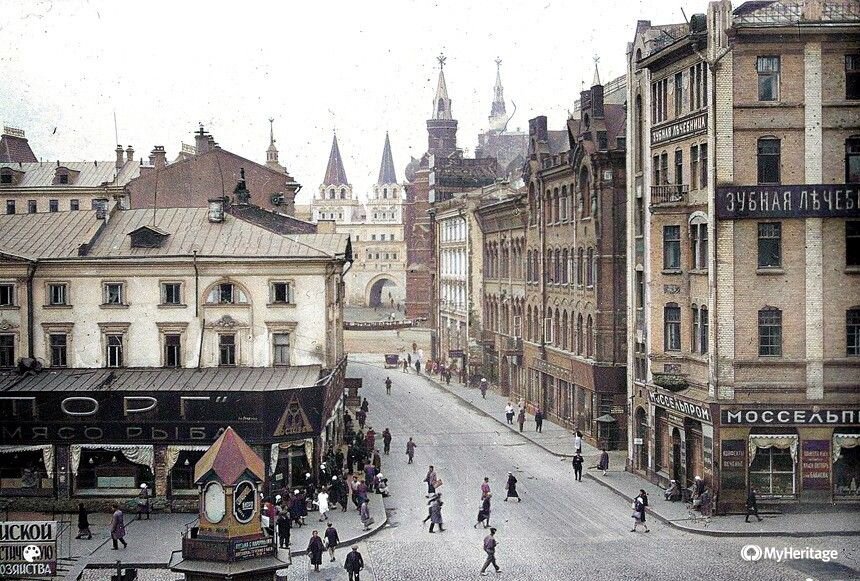 Москва 1920-х – 30-х годов – это время перемен. Но сегодня мы больше будем смотреть на Москву до глобальных советских перестроек. Фотографии и фотоаппараты в то время были уже довольно качественные, а ценное наследие еще пока украшало город. Так что отправляемся в старую Москву, которой оставалось существовать на момент снимков совсем недолго. 1) Тверская улица у Охотного ряда 1931 год Сейчас этому месту в городе очень не хватает застройки! Да, раньше Тверская улица шла напрямую к Историческому музею. Получается, что вы выходили с Красной площади и сразу попадали на узкие городские улицы старой Москвы. Ныне Манежная площадь неуютная... а зимой еще и сильно продувается. 2) Пробка на Мясницкой улице 1928 год Мясницкая улица в те годы была важной транспортной артерией Москвы. Как видно на фото, без метро в городе тогда была суматоха: повозки, машины, трамваи, автобусы. Все смешивалось в одну кучу! 3) Здание службы госбезопасности 1932 год Здание ФСБ/КГБ имеет еще дореволюционную основу!