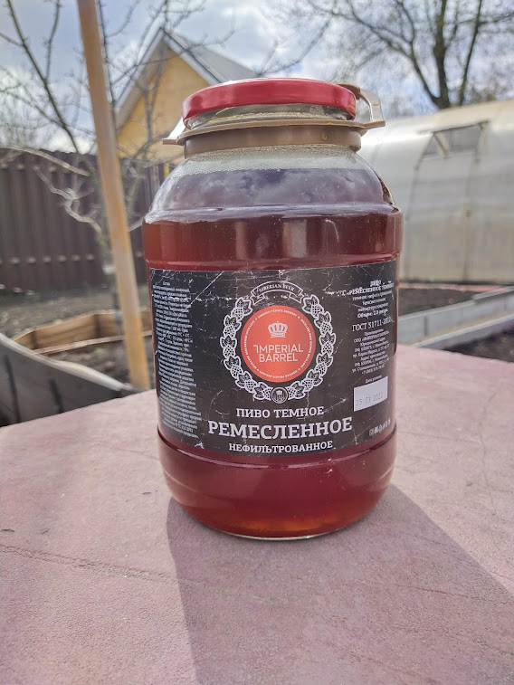 Вот и пришла пора перейти на тёмную сторону пивоварни "Империал Баррель". Для этого я взял баночку "Ремесленного Темного" и поехал на дачу, дабы поделиться подарком из Новосибирска со своими близкими. Ведь баночка не простая, а двухлитровая. До конца срока годности оставался один день, на календаре воскресенье, Пасха. Самое время выпить по кружечке пивка. Только почитаем, что про него рассказывает производитель: "Ремесленное" Темное - лагер с насыщенным ароматом и кофейно-шоколадными нотками, которые придает жженый солод. Благодаря тому, что пиво нефильтрованное, вкус получается более насыщенным и в то же время мягким. Банку я нигде не валял и не катал, этикетка такой и была, видимо, искусственно состаренной( в отличие от предыдущих двух бутылок, у которых бумажки намокли при транспортировке). Пиво "Ремесленное темное" темное нефильтрованное неосветленное непастеризованное. Состав: вода, солод пивоваренный ячменный, хмелепродукты, дрожжи пивные. Алкоголь 4,4%, плотность 13%, объём 2 л