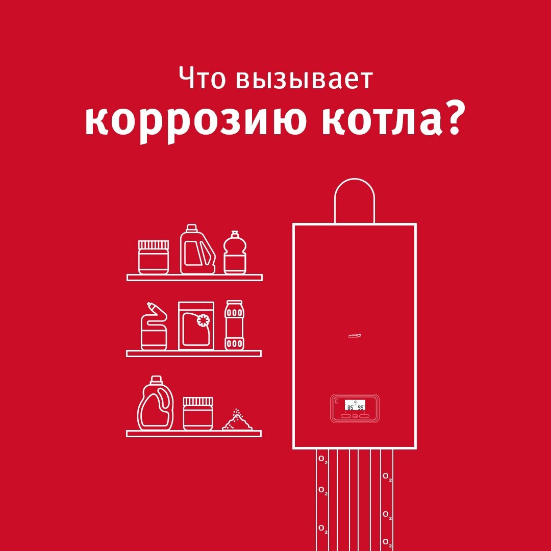 Химикаты и кислород в системе отопления вызывают коррозию отопительной техники. Не храните в котельной химикаты и не устанавливайте атмосферный котел прямо внутри мебельной мастерской. Следите, чтобы воздух для горения не был загрязнен фтором, хлором и пылью. Так не будет ржавчины в камере сгорания котла, в дымоходах и воздуховодах. Дополнительно не забывайте проверять герметичность труб. Кислород в системе отопления вызывает коррозию деталей котла так же, как загрязненный красками и растворителями воздух. #коррозия #отопление #ГВС #котел #системаотопления