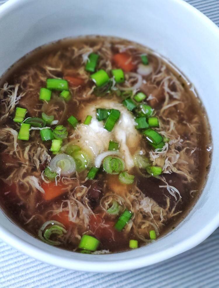 Яйца перемешиваем до однородности и вливаем тонкой струйкой в суп. Варим всё вместе ещё 10 минут.