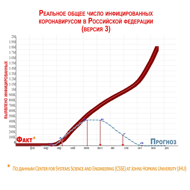По версии прогноза №2 от 28.07.2020 мы уже должны были миновать пик точку "В" (см. https://goo.su/3zNffC), но реальность всё больше и больше не соответствует прогнозам (см. график).