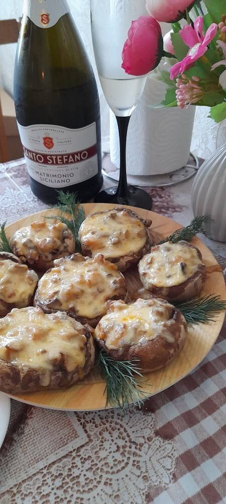 Украшение не только праздничного стола, но и замечательная закуска в будний день. Готовится легко и быстро, а если кто худеет, то это блюдо ваше) Ингредиенты: Крупные шампиньоны (у меня 7 шт), Мякоть одного куриного бедра, небольшая луковица, сливок 10%, сыра, Соль, перец, раст.масла Способ приготовления: Шампиньоны помыть, ножки вырезать и мелко порезать. Жарим на сковороде с луком. Мясо бедра мелко порезать и добавить к грибам с луком. Тушить минут 7. Влить сливки, довести до загустения и снять с огня. Посолить и поперчить по вкусу. Шампиньоны смазать кисточкой внутри растительным маслом и посолить немножко. Наполнить грибы начинкой, выложить на противень и отправить в разогретую до 180° духовку на 20 минут. За 5 минут до готовности посыпать тертым сыром и запекать ещё 5 минут. Готовые грибы выложить на блюдо и украсить.
