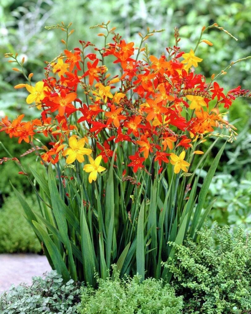Крокосмия,или монтбреция -это два разных названия одного и того же растения.Есть еще и третье название-тритония,ну а в народе это растение чаще всего называют ,,японский гладиолус,. Крокосмия-клубнелуковичное многолетнее растение немного похожее на гладиолус. Цветет с июля по сентябрь. В садоводстве используется крокосмия обыкновенная (крокосмиецветная) — высота стеблей до 100см. Яркие желтые, оранжевые, красные цветки собраны в метельчатые соцветия. Крокосмия светолюбива, цветет обильно и долго на солнечных места. Неплохо растет и в полутени. Сажают ее обычно в апреле-мае, крупные клубнелуковицы — на глубину 6-8 см, мелкие — на глубину 3 см. Расстояние между луковицами чаще всего 10-15см. Очень ранняя посадка не рекомендуется из-за слишком высокой влажности еще холодной почвы. Перед посадкой полезно подержать клубнелуковицы и детки неделю в тепле. Непосредственно перед посадкой намочить в слабом растворе марганцовки. Почва должна быть питательной, рыхлой достаточно влажной. Застоя