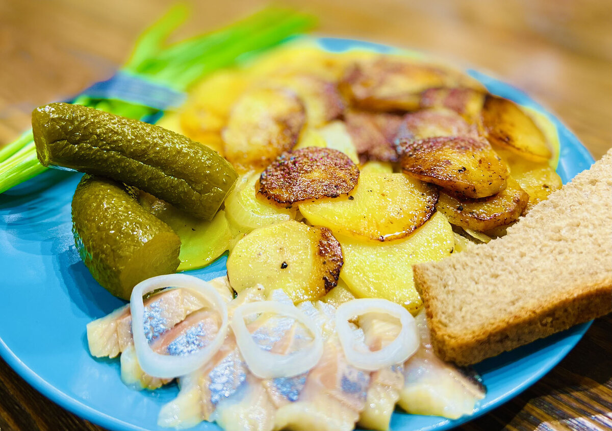 Ингредиенты: Приготовление Картофель чищу, мою и нарезаю тонкими пластинами. Также кружочками нарезаю одну среднюю головку репчатого лука. На сковороде растапливаю сливочное масло и первым слоем выкладываю картофель. Сверху картофеля выкладываю кольцами лук. Солю и перчу по вкусу. Далее повторяю также с двумя оставшимися картофелем. Каждый слой солю и перчу. Жарю под закрытой крышкой минут 5. Потом переворачиваю и обжариваю под закрытой крышкой другую сторону минут 5. Пока картофель обжаривается нарезаю одно филе соленой сельди и достаю из банки два маринованных огурчика. Выкладываю картофель на тарелку, рядом кладу два маринованных огурчика и филе сельди. Получается очень быстро и очень вкусно. Что может быть вкусней жареной картошки на сливочном масле. Если только пожарить ее на беконе или свиных шкварках. Но это уже другая история). По рекомендации супруга к этому ужину не хватает разве что пятьдесят капель беленького) Думаю что это дополнение додумает для себя каждый сам. Друзья же