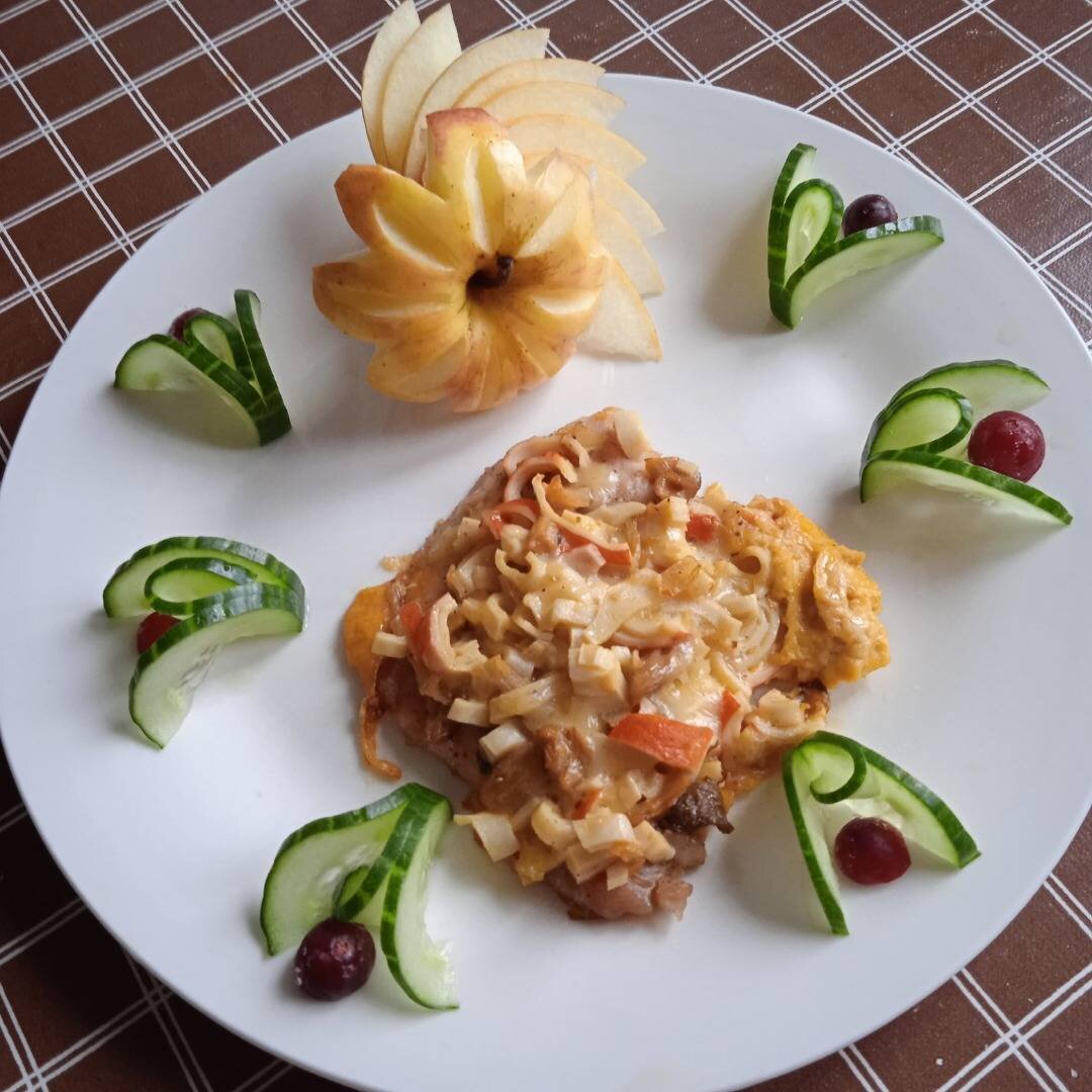 Подбор продуктов в этом блюде кажутся не сочетаемые, но поверьте приготовив один раз, вам захочется приготовить ещё. Мясо получается нежнейшее. #академия Ингредиенты: свинины, луковица, крабовых палочек, сыра, шампиньонов, йогурта без добавок, яйца, соль, перец, растительное масло Способ приготовления: Лук порезать четвертинками, обжарить на растительном масле. Грибы нарезать слайсами, добавить к луку, обжарить, посолить. Крабовые палочки нарезать кусочками, положить в миску. Сыр натереть на крупной тёрке, положить к палочкам, туда же положить обжарку. Добавить йогурт, желтки яиц, перемешать. Мясо нарезать кусочками, толщиной 1,5-2 см, отбить, посолить, поперчить, с двух сторон. Противень смазать растительным маслом, выложить свинину, на неё начинку. Выпекать при t 210, 25 минут. Под противень поставить ёмкость с водой.