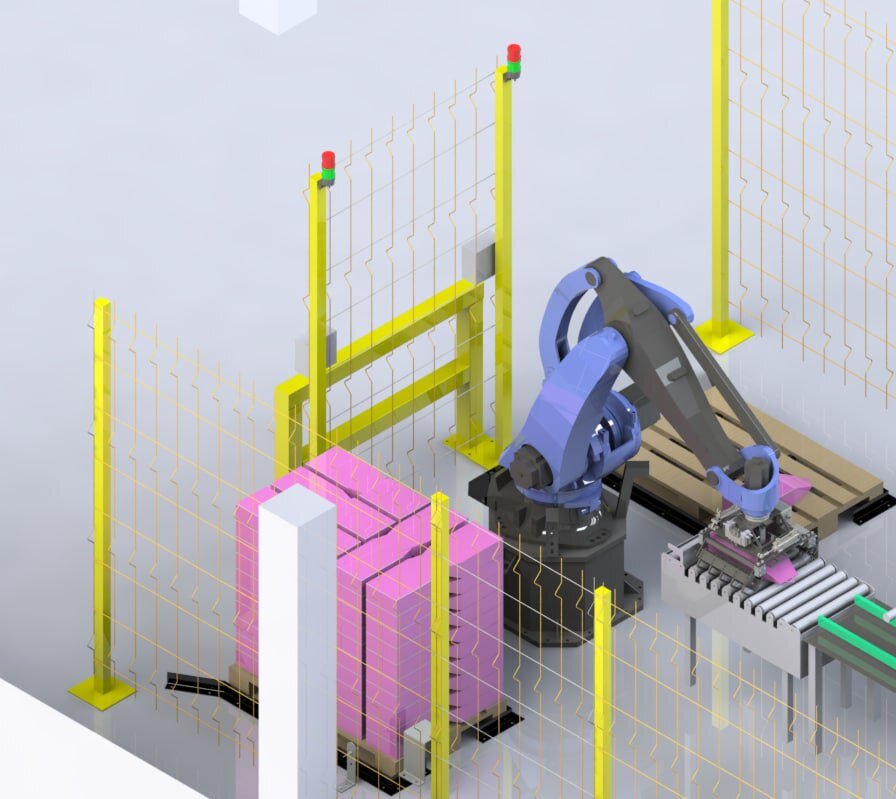 Роботизированный программно-аппаратный комплекс автоматической подачи кошачьего наполнителя и автоматического паллетирования состоит из: Ленточный конвейер оснащен специальным ограждением в начале для укладывания мешка, поворотным колесомупором для разворота мешка на 90 градусов и специальным ограждением в конце для позиционирования мешка. Также имеется «плоскователь» мешка для равномерного распределения содержимого по всему мешку. Рольганг оснащен приводом, что позволяет всегда мешку доехать до контрольной точки. Робот KR 40 PA укладывает мешки на паллеты. Комплекс оборудован системой безопасности: Устройство захвата мешков роботом было спроектировано и изготовлено на мощностях Metra ROBOTICS. Реализована возможность покрасить промышленного робота. Итоги проекта Роботизированная ячейка увеличивает производительность линии на 25%. Уход от человеческого фактора не только избавил сотрудников от тяжелого ручного труда, но и позволило достигнуть высокого качества укладки готовой продукции