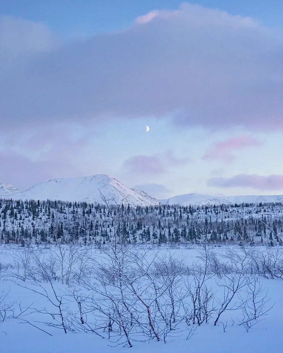 Сегодня публикую подборку северных пейзажей с родными Хибинами... Основная масса людей зимой для прогулки из Кировска к озеру Малый Вудъявр выбирает снегоходный транспорт. Но несмотря на мороз в - 15°С и ветер, мы решили пройти пешком круг около 7 километров и поискать выгодные ракурсы. Январская полярная ночь сильно ограничивала во времени и далеко забраться не получилось, но кое-что снять все же удалось. Больше всего понравились облака, подсвеченные, появившиимся ненадолго, солнцем. Особенно они впечатлили на 3,4 кадре. А на последнем фото на горе я разглядел чью то физиономию, которая в зависимости от ракурсов напоминала, то кошачью морду, то какого-то уродца. Долго думал какой кадр воткнуть на заглавную и решил, что по цвету кадр с месяцем самый интересный. Несмотря на однотипный пейзаж работы получились разные. Листайте⬅️ и выбирайте самую интересную.