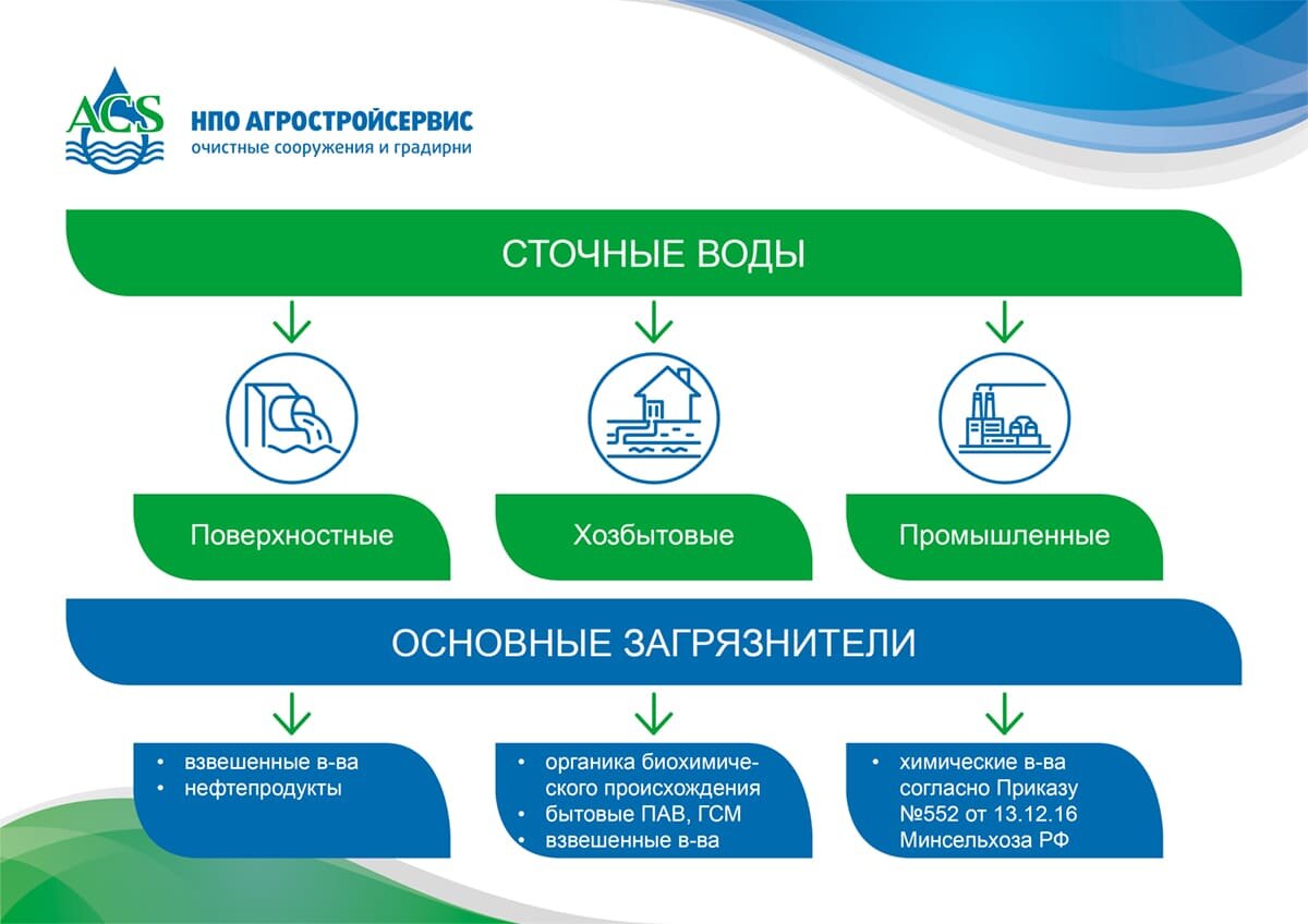 Сточная вода характеризуется наличием примесей различного характера, не позволяющих ее применение в бытовой и технологической сферах. Рассмотрим основные категории сточных вод, которые определяются на основании их происхождения, качественных параметров и концентраций содержащихся в них загрязняющих веществ, специфики очистки: Хозяйственно-бытовые стоки образуются в результате жизнедеятельности человека и проистекают от многоквартирных домов, административных корпусов, предприятий сферы обслуживания населения, объектов культуры и отдыха и т.п. Промышленные стоки образуются как результат технологического процесса предприятий различных отраслей. Подобные отходы не соответствуют по качественным параметрам установленным нормативам, подлежат удалению из технологического процесса как невозвратные потери. Промышленные стоки различаются условиями возникновения и составов загрязняющих веществ, разделяясь на основные типы: Ливневые сточные воды происходят, как правило, из атмосферных осадков (до