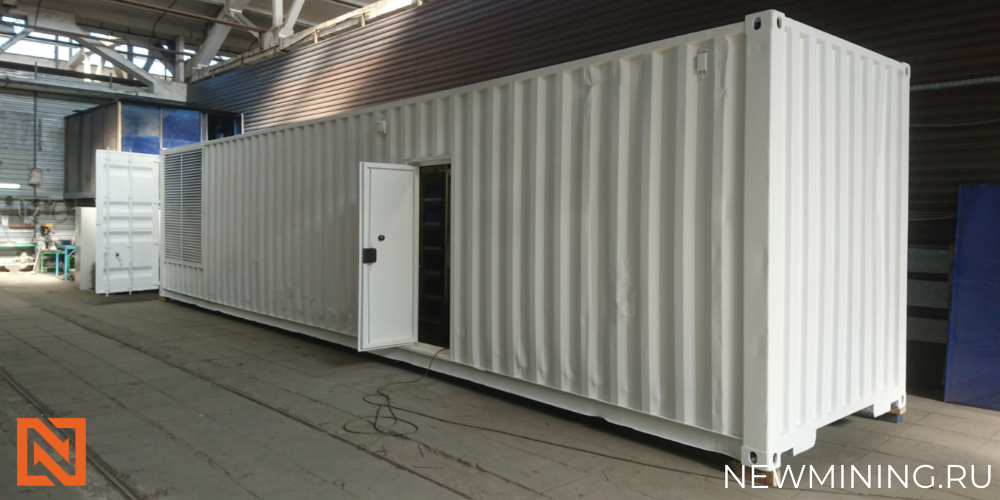 Вычислительный контейнер состоит из основного блока 12м в длину, 3м в высоту, 3м в ширину и блока камеры обратного потока и смешения воздуха. Внутри находятся стальные стеллажи для размещения 500 асиков. Подведена электросистема и сделаны щиты. Для подключения используются розетки, каждая из которых подключена к отдельному автомату на щите питания. Дополнительно устанавливаются охранная, пожарная сигнализации, видеонаблюдение и проводится интернет. Для притока воздуха в контейнере используются два вентилятора. Выход воздушных потоков осуществляется с двух сторон через жалюзи. В специальной камере располагаются кассетные фильтры, не допускающие попадания внутрь частиц пыли и грязи. Зимой в мобильных ЦОД используются тепловые пушки для прогрева до оптимальных температур. Мы приложили максимум усилий для повышения эффективности и надежности контейнеров. Корпус защищен от коррозии и перепадов температур, а срок службы составляет 15-20 лет. Контейнер полностью готов к работе, его можно под