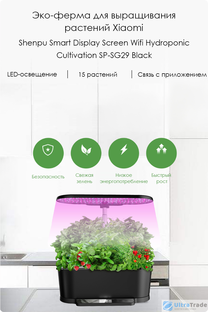 С экофермой для выращивания растений Xiaomi Shenpu Indoor Hydroponik Smart Garden SP-SG29 можно получать свежую зелень и овощи круглый год прямо дома. Данная модель отличается возможностью управления через приложение. Простое использование В основе прибора лежит принцип гидропоники – выращивание растений без использования земли. На воде и удобрениях растения всходят быстрее. В комплекте поставляются удобрения с необходимыми питательными веществами для естественного выращивания растений, без гербицидов, пестицидов и без ГМО. Установлена система циркуляции воды при помощи насоса. Благодаря светодиодам растения получают необходимое освещение для лучшего роста. Поэтому размещать установку можно даже в помещении без естественного освещения. Выращивать растения – просто В комплекте есть все необходимое для успешного садоводства и огородничества. Вам нужно будет только приобрести те семена, которые вы хотите выращивать. Управление На сенсорной панели кнопки, которые отвечают за включение, ра