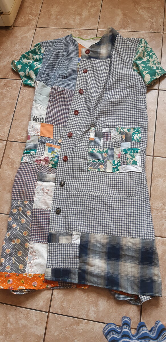 Недавно я рассказывала, что теперь при переработке старой одежды сортирую лоскуты на х/б и трикотаж, потом собираю из них общую "ткань". Из нее я собираюсь кроить маме "рабочку" на участок. Это ее идея, а исполнение, пусть и кривое, но мое :). Итак, первый халат! Мне очень понравилось. Учитывая, что ткань б/у и пуговицы тоже, я ожидала, что будет хуже. А тут вполне симпатично, как мне кажется. Да, было много проблем с сшиванием. Я сшиваю запошивочным швом, так как считаю его самым прочным. А для рабочей одежды это важно. И нередко швы от соединения лоскутов находят друг на друга, получаются толстыми, игла машинки съезжает. Но я знала, на что шла. Кроила по старому изношенному вдрызг халату :). Удивительно, что ткань еще не рассыпается))). Но особенно мне нравятся карманы. Они собраны из маленьких кусочков. Прочные, разноцветные :). Результатом я довольна. Осталось дождаться примерки. Надеюсь, ничего не перепутала. А если перепутала, то легко переделаю :). У этого халата есть главное