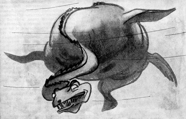 И вот однажды три взволнованных человека рассказали ему, что видели гигантское чудовище, которое отдыхало на краю болота. На их глазах оно поднялось на ноги и, скользя по обрыву, спустилось в воду. У чудовища длинная шея, маленькая змеиная голова и лапы, как у гигантской ящерицы.