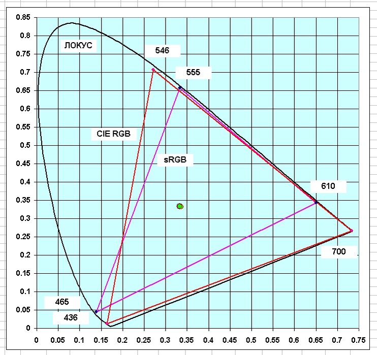 Четыре лучше трех: раздвигаем горизонты Прекрасен и многоцветен окружающий нас мир. И это благодаря нашему зрению. Но мы все больше и больше смотрим в экраны телевизоров, компьютеров, телефонов. А как обстоят дела в этом экранном мире? Локус и стандарты В экранном мире существует всего три базовых цвета: красный, зеленый и синий, образующие цветовой треугольник в локусе CIE XYZ. Напомним, что локус - это все разнообразие цветов, воспринимаемых зрением. Наиболее распространенным на сегодня стандартом является стандарт sRGB. Он самым подробным образом представлен в интернетовских статьях. А пределом того, что можно получить, используя три базовых цвета, является стандарт CIE 1931 RGB. Базовые длины волн стандартов выбраны достаточно произвольно (для sRGB - близко к спектрам телевизионных люминофоров, для CIE RGB - с привязкой к спектрам паров ртути). В локусе эти цветовые треугольники выглядят так. Нам важно оценить, насколько эти треугольн