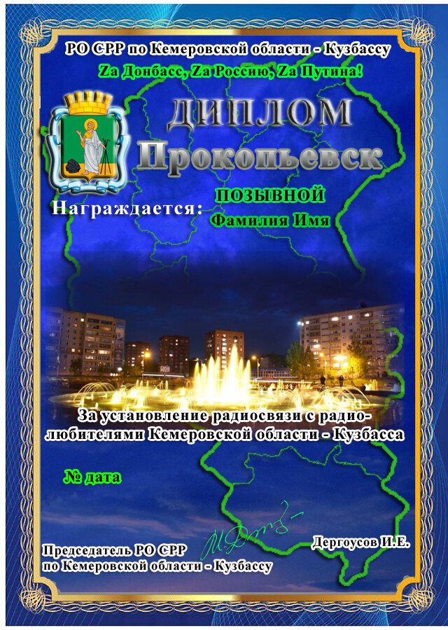 Положение диплома «Прокопьевск» Диплом «Прокопьевск» учреждён региональным отделением Союза радиолюбителей России по Кемеровской области – Кузбассу в рамках дипломной программы «Огни вечерних городов Кузбасса». Диплом выдается радиолюбителям Российской федерации, странам ближнего зарубежья, соотечественникам и русскоговорящим радиолюбителям дальнего зарубежья. Для его получения необходимо набрать: В 2022 - 372 очка, в 2023 году - 373 очка и т.д. за радиосвязи, проведенные с радиолюбителями города Прокопьевск и Кемеровской области - Кузбасса. Прокопьевск расположен на юге Кемеровской области, в предгорьях Салаирского кряжа. Свои истоки он берёт в 1650 году с основания деревни Монастырской, ставшей впоследствии селом. Исторически так сложилось, что город первоначально строился на базе 23 отдельных посёлков, которые возникли рядом с угольными предприятиями. Самая старая часть города расположена вдоль реки Аба, притока Томи. Улицы здесь узкие, дома преимущественно одноэтажные. Такую же зас
