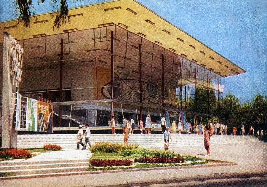 Ещё один кинотеатр в городе, который изначально тоже носил название «Сочи». Это здание внешне отличалось от других кинотеатров и было больше похоже на театр: высокие колонны, цветочный орнамент, богатый декор. Рядом был большой зелёный сквер, где можно было посидеть на скамейках, наслаждаясь морским видом. Кинотеатр в стиле сталинского классицизма построили ещё в 1953 году, когда возводилось здание Морского вокзала. Это был проект советского архитектора П. Г. Стенюшина, который создал различные проекты административных и жилых зданий по всей стране.