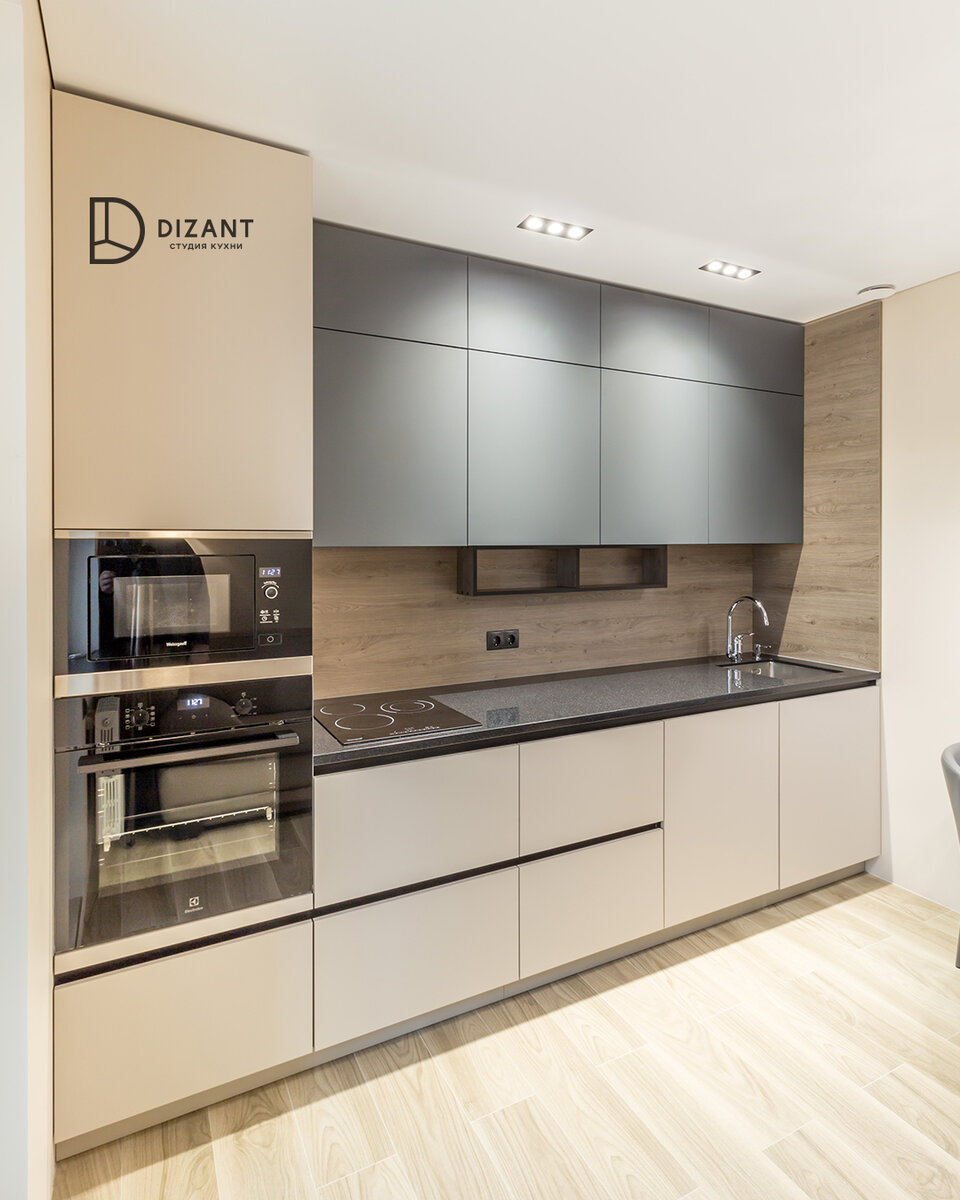 Данный проект, стал лучшим в сентябре-октябре, по результатам голосования среди наших 240 тысяч подписчиков в инстаграм. Больше фото опубликуем в конце статьи. Что хотелось бы отметить, — заказ оформляли когда ещё не было напольного покрытия и потолочного. Как видите, везде попали четко. Глубина нижних модулей не стандартная, 70 см, увеличили таким образом рабочую поверхность. Ну и супер матовые фасады, в навесных модулях здесь Fenix, вы наверное уже в курсе, что это такое и как они круто выглядят. По фото видно, как они замечательно выглядят поглощая в себя свет. Ну и рассказываем в деталях: • Фасады пенала и столов — МДФ покрытая супер матовым пластиком Perfect Sense U702 EGGER;