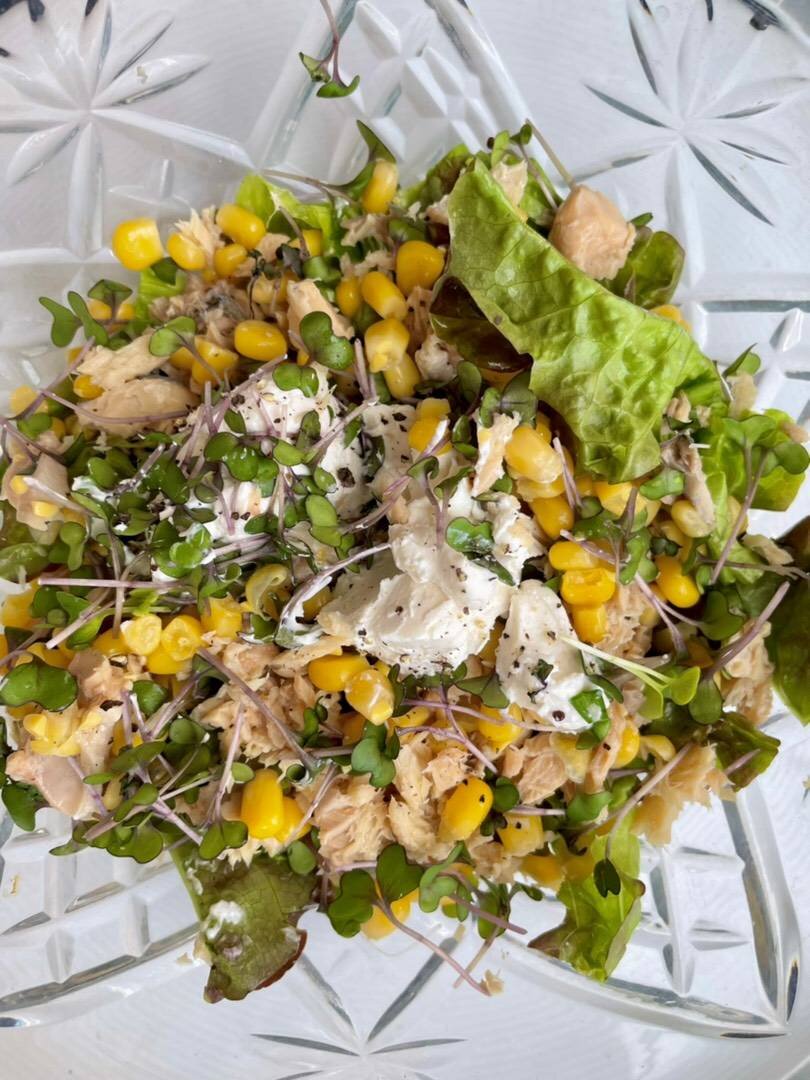 Ингредиенты: Салатные листья, Горбуша консервированная, Кукуруза консервированная, Микрозелень капусты, Творожный сыр или сметана, Молотый чёрный перец