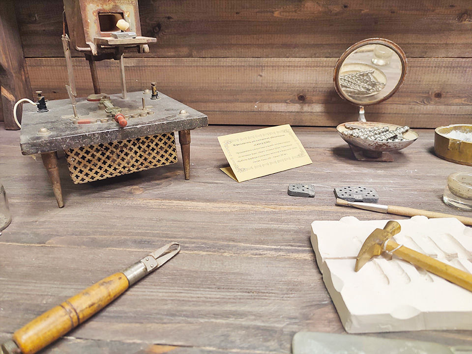 Здесь я сразу обратила внимание на стол с разными интересными предметами для протезирования зубов. Своеобразная зуботехническая лаборатория начала XX века.