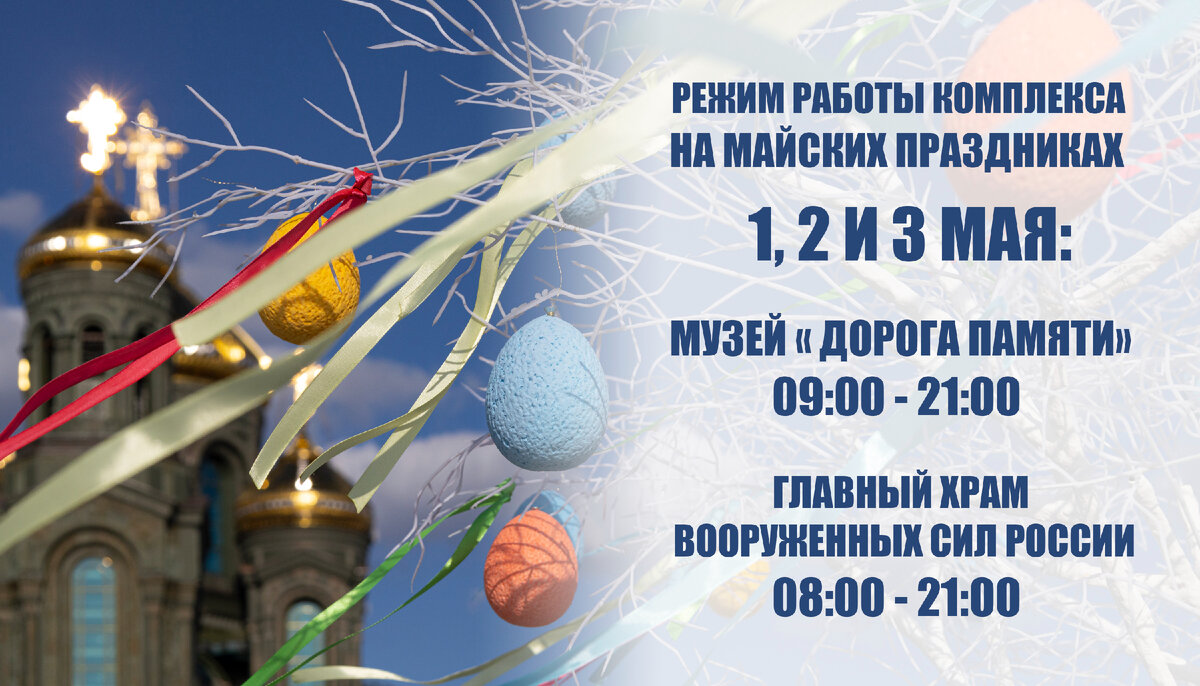 Уважаемые посетители! Музейно-храмовый комплекс ВС РФ Минобороны России с 1 по 3 мая 2022 года работает по графику выходного дня: