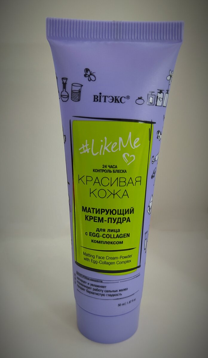 Добрый день! Рада приветствовать Вас на своём канале. Блестящая кожа, из-за избыточного выделения кожного жира доставляет массу неудобств. От некрасивого эстетического вида, до появления высыпаний на лице. Косметология не стоит на месте и новые средства, способны решать проблему жирного блеска. Сегодня хочу представить вам 5 кремов от белорусского производителя, действие которых направлено, делать нашу кожу матовой. 1. Матирующий крем-пудра для лица с EGG-COLLAGEN комплексом. Линейки likeMe, белорусского производителя Витэкс. Крем хорошо увлажняет кожу, повышает упругость, выравнивает тон лица. Специально разработанный EGG-COLLAGEN комплекс способствует устранению жирного блеска кожи, делает поры менее заметными, придаёт дерме матовость, и этот эффект продолжительное время сохраняется на коже. При регулярном использовании улучшает работу сальных желез, и решает проблему избыточного выделения кожного жира. 2. Матирующий CICA-крем с ионами серебра и центеллой от акне и восп