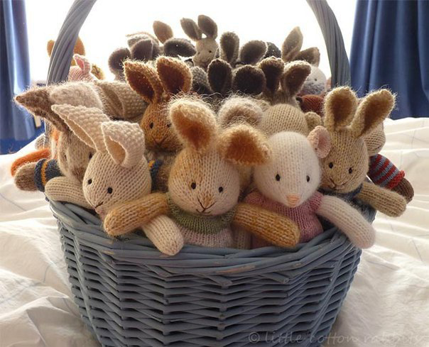 Замечательные милые зайчики, связанные спицами. Это отличный подарок, сделанный своими руками.