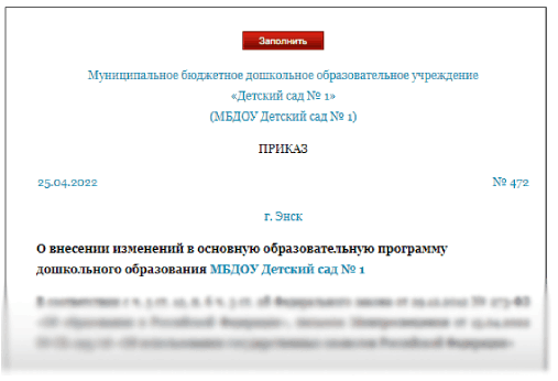 Предлагаем образец приказа, чтобы утвердить изменения в ООП ДО. Их нужно внести по рекомендации Минпросвещения. Дополните программу детского сада мероприятиями по знакомству с государственными символами. Минпросвещения рекомендует детским садам дополнить ООП ДО мероприятиями по знакомству с государственными символами. Поручите воспитателям запланировать церемонии поднятия государственного флага и исполнения гимна страны. Проводить их с мая 2022 года советует Минпросвещения (письмо от 15.04.2022 № СК-295/06). В плане летней работы с дошкольниками нужно запланировать занятия по ознакомлению детей с госсимволами страны. Занятия можно провести в рамках любой образовательной области из ООП ДО (письмо от 15.04.2022 № СК-295/06). Предварительно в программу нужно внести изменения. В целях воспитательной работы 22 августа поручите предусмотреть воспитательные мероприятия ко Дню государственного флага России (распоряжение Минпросвещения от 23.08.2021 № Р-196). Оформите приказ об изменении ООП Д