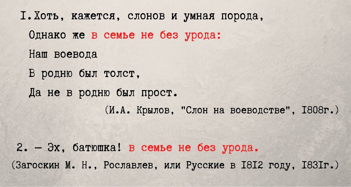 Я когда-то встретила очень неожиданную и красивую версию происхождения этого выражения, которая меня впечатлила настолько, что я решила разобраться. Русским Языком докладываю вам результаты своих изысканий. #русский язык #происхождение слов #образование #интересные факты #развлечение Что означает поговорка «В семье не без урода» сейчас Обычно мы имеем ввиду человека, отличающегося от группы людей, в которую он включен, в отрицательную сторону. Неуспевающий ученик в классе, нерадивый сотрудник в рабочем коллективе, бунтарь на родительских собраниях или действительно «непутевый» член семьи. Важно, что это качество, отличающее его в худшую сторону от всех остальных. По мнению этих самых остальных, разумеется. Появление поговорки "В семье не без урода" в русской литературе и в словарях Скорее всего, впервые это выражение появилось в басне Крылова, после чего широко распространилось по литературе (цитата выше). В 1853 году оно зафиксировано в книге В.И. Даля «Пословицы русского народа» аж