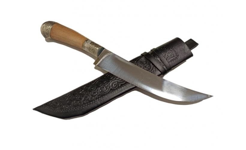 Не является исключением в этом смысле и эта модель пчака ручной работы "Афганка 95х18 Тамерлан". При одном взгляде на этот нож трудно поверить, что это произведение искусства является обычным рабочим ножом. Он изготавливается из стали 95х18, пользующейся популярностью среди производителей ножей за устойчивость к коррозии и деформации при значительных нагрузках. Рукоять ножа выполнена из твердых пород дерева, а ее форма как нельзя лучше приспособлена для удобства при удержании при выполнении любой работы. Поэтому такой нож окажется одинаково желанным предметом, как в любой коллекции холодного оружия, так и на кухне человека, ценящего комфорт и качество кухонных инструментов.