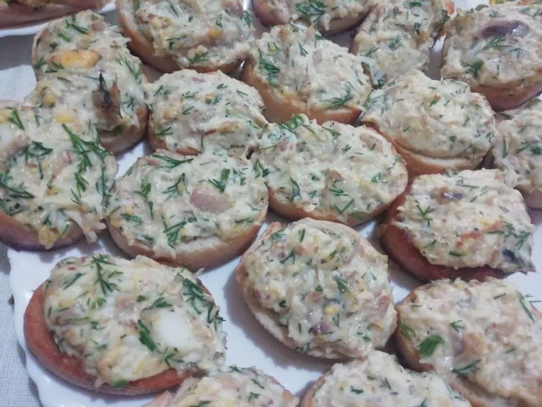 Хорошая закуска на праздничный стол. Ингредиенты: Тунец консервированный, Яйцо куриное, Лук репчатый/красный, Багет, Зелень, Чеснок (если любите), Майонез, Соль, специи Способ приготовления: Тунца выложить в миску (жидкость слить), размять вилочкой. Яйца отварить, натереть на терке. Зелень нашинковать. Чеснок (если добавляете) пропустить через пресс. Багет порезать, подсушить на сухой сковороде с двух сторон. В миску с тунцом добавить яйца, чеснок, соль, специи (если хотите), майонез, хорошо перемешать. Выложить на кусочки намазку. Приятного аппетита!