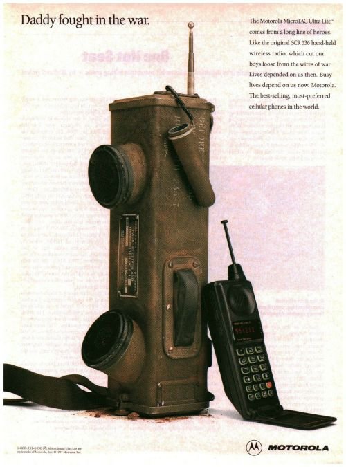 Реклама сотовых телефонов Motorola MicroTAC Ultra Lite с изображением их «отца» SCR-536, портативного радиопередатчика, использовавшегося Корпусом связи армии США во время Второй мировой войны (1994 г.).