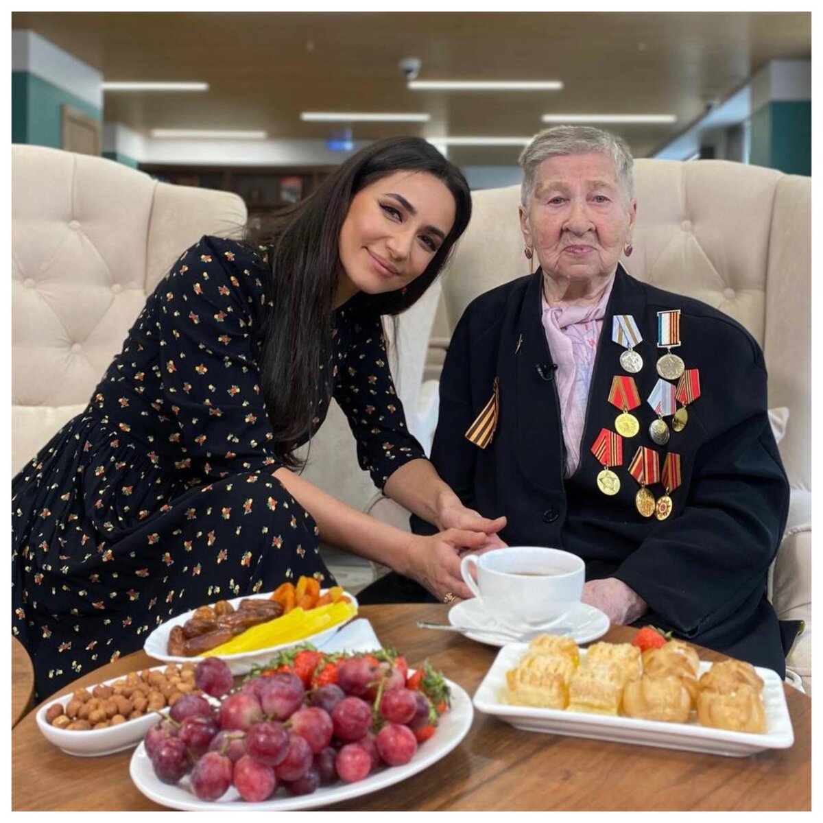 Певица Зара не стала дожидаться Дня Победы и приехала в гости к ребенку войны Антонине Петровне Потаповой. Теплая компания, вкусные угощения и совместное исполнение легендарной композиции «День Победы» порадовали ветерана. Оценили жест и фанаты артистки. Совсем скоро большая часть россиян выйдет на шествие в Бессмертном полку. Близится День Победы. Одной из первых поздравить ветеранов решила певица Зара. Знаменитость приехала в гости к Антонине Петровне Потаповой, ребенку войны. Когда страна была втянута в войну, Антонине Петровне было всего 10 лет. Но даже будучи совсем ребенком, она ухаживала за бойцами советской армии, прятала их у себя дома. Все военные годы, тогда еще совсем девчонка, Петрова работала в колхозе, с утра до ночи, а потом вязала солдатам носки, шарфы, стирала бинты. «Низкий поклон Антонине Петровне и в ее лице всем нашим ветеранам и героям. Любим, помним, гордимся», — написала под общими снимками с ветераном Зара. Кроме совместного чаепития и разговора по душам, арти