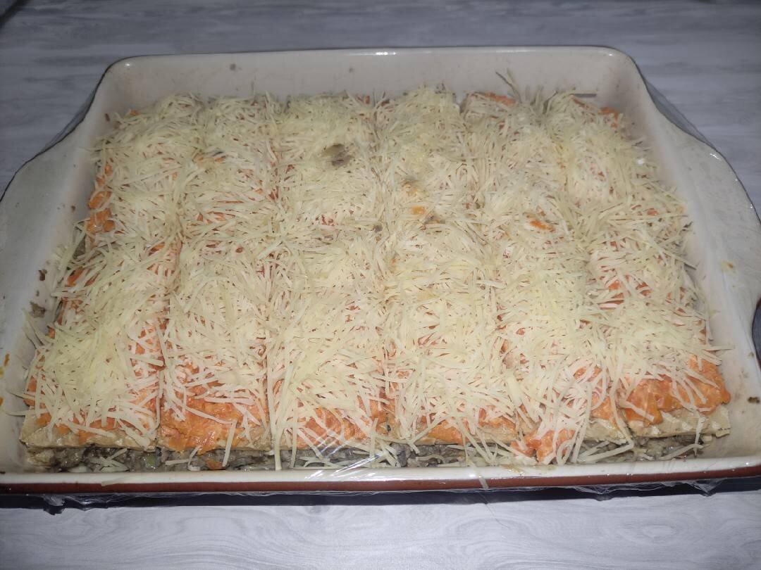 Берем вафельные коржи и выкладываем салат слоями: 1 корж - селёдка; 2 корж - грибы; 3 корж - морковь; 4 корж - селёдка; 5 корж - грибы; 6 корж - морковь И сверху посыпаем тертым сыром (можно добавить к сыну еще немного уропчика)