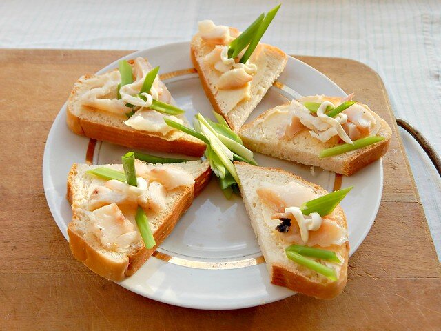 На прямоугольный ломтик белого хлеба, намазанный маслом с горчицей (см. «массы и масляные смеси к бутербродам»), положить кусочек рыбы (осетрины, севрюги, зубатки, морского окуня), на него немного майонеза. Сверху бутерброд украсить зеленым луком.