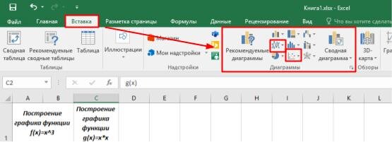 Для создания графика в программе MS Excel на основе таблицы с данными воспользуемся разделом Диаграммы на вкладке Вставка ленты инструментов. Разберём подробно инструменты: График и Точечная. Эти виды диаграмм соответствуют привычным математическим графикам.